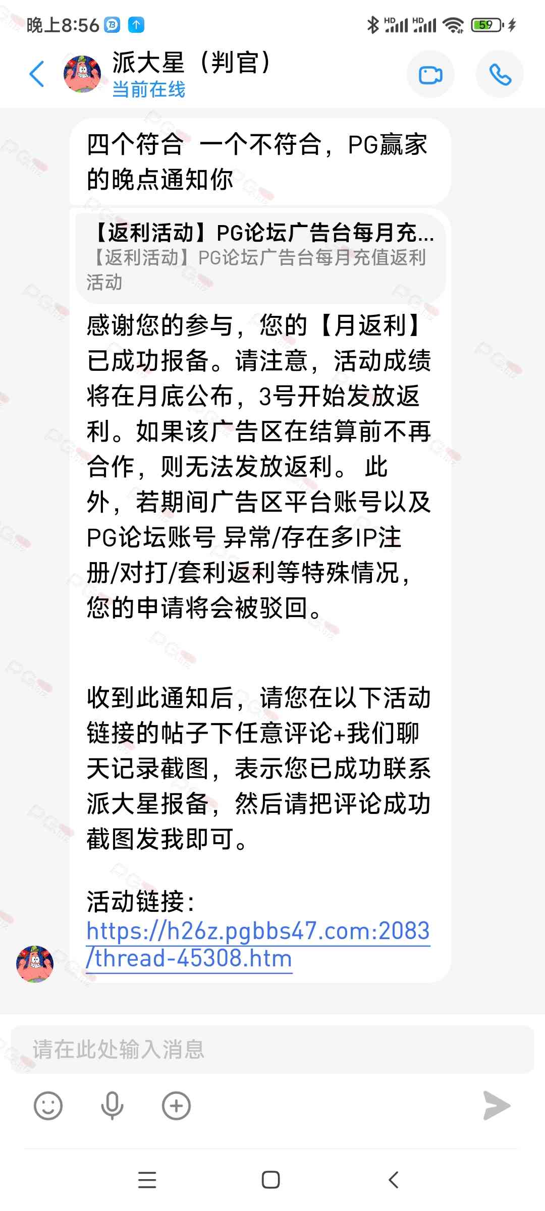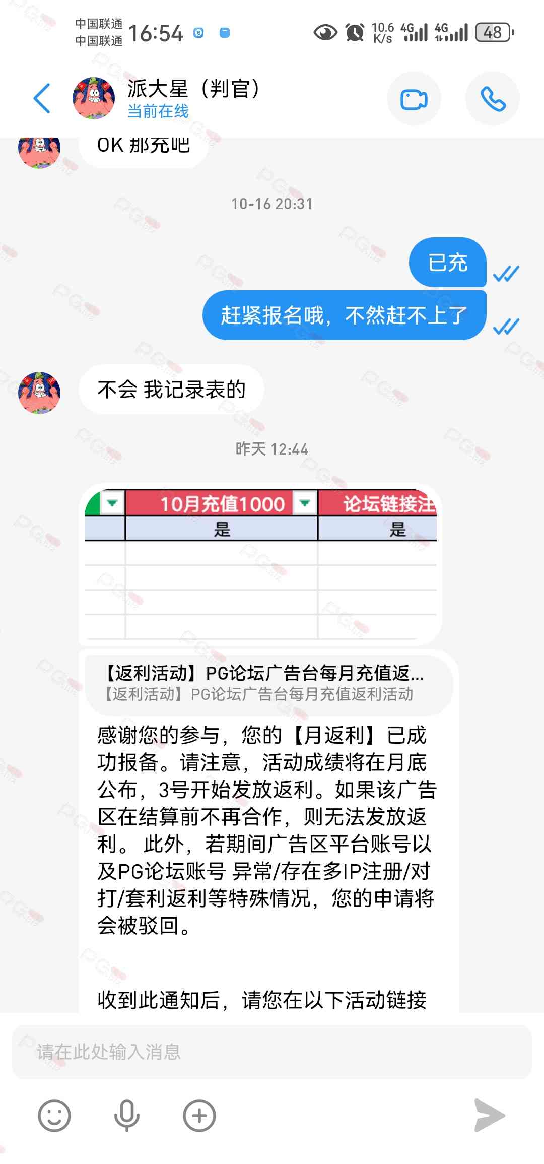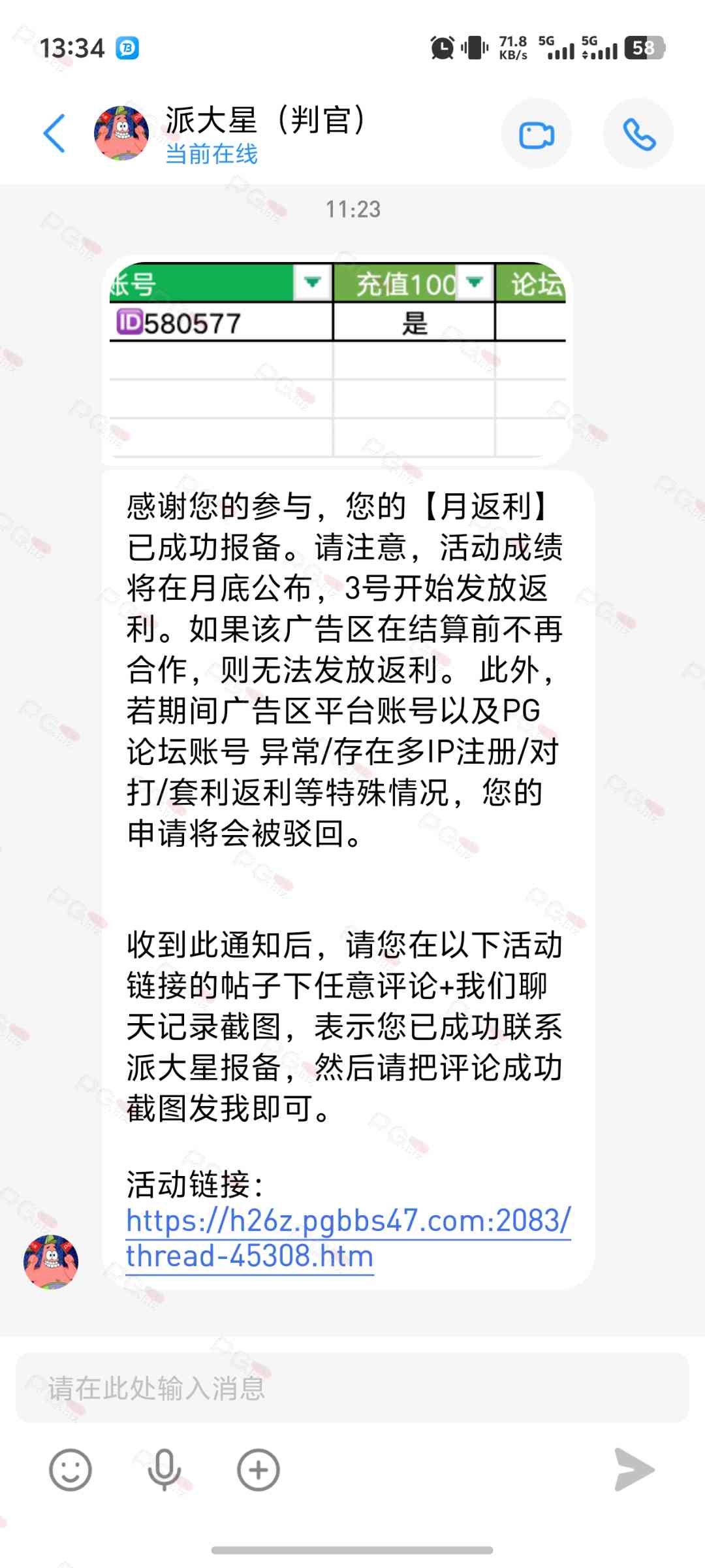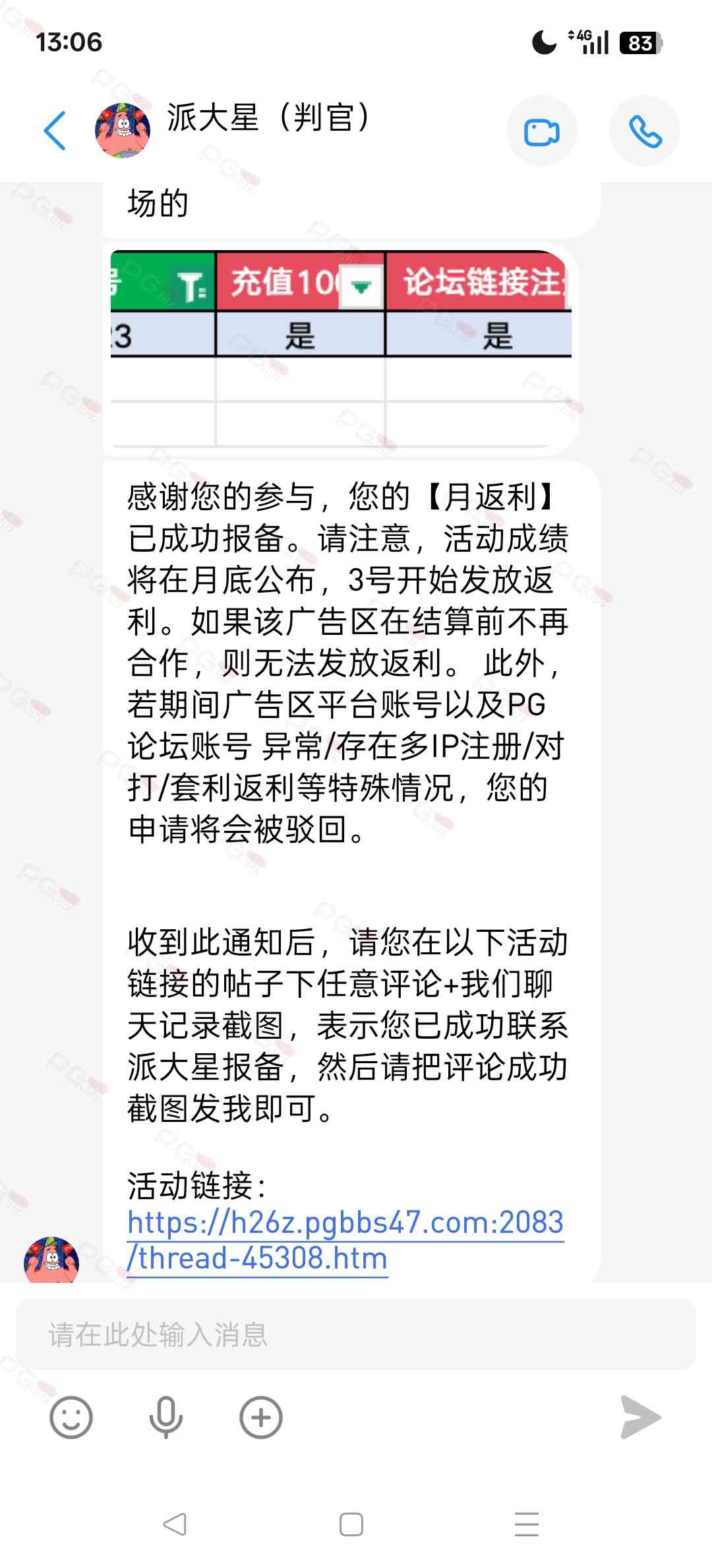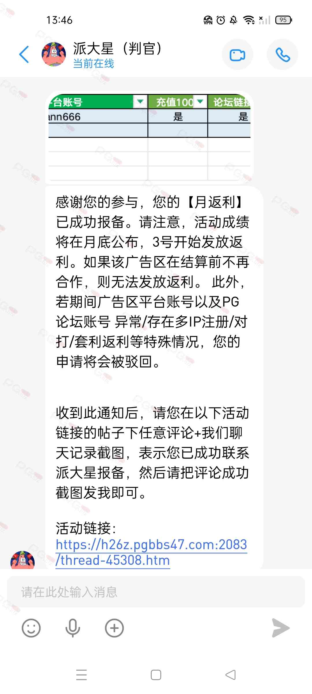 由于现在PG论坛越做越好、流量越来越高,越来越多台子来PG论坛上广告,幸运星的日子也是渐渐好起来了。论坛的进步都是靠PG论坛的兄弟们的支持。幸运星深知做人需要饮水思源的道理。正所谓施惠勿念,受恩莫忘,是时候回馈给大家了!PG论坛决定增设一个新的福利—— PG论坛广告台每月充值返利活动,以下我们简称为 【月返利】只要您在PG论坛任何一个广告区内的台子充值超过一千元,请即刻联系派大星报备,一个台子有50个名额,只要是前50名的申请的都可在下个月3号得到返利88元,不同台子可以重复申请,例如您在台子A和台子B都充值了超过一千元,都可以一齐申请,得到双份奖励!只限前50名,必须是论坛链接注册的,如果不是论坛链接注册的申请无效!(包含担保区、广告区、置顶区、横幅区,如有同时上几个广告区的台子也只能算一个,例如台子A同时上了广告区和横幅区,只是算一个)有点要说明,每个月三号结算,如果结算前该台子广告已到期不续广告,只能算无效,例如会员A在B台子10月份充值了1000元,但是11月2号该台子到期不续费了,3号结算月返利的时候所有在B台子充值过的都判为无效,不给予返利,论坛也不会做出任何补偿,望知悉。如果有中途不续费的台子,论坛会在广告合作到期的帖子通知点击浏览广告已到期不续费的台子以下是目前广告区的台子,共12家,排名不分先后1.九鼎国际 2.PG电子0870 3.威尼斯人9884 4.优越会2333 5.PG1电子 6.九鼎娱乐 7.金沙4280 8.葡京赌场4064 9.皇冠赌场10.HOME体育 11.葡京集团047 12.云霄体育12家台子,各50个席位,一份88元,也就是 12*50*88=52800大家可别嫌少,对于论坛来说这是笔不小的开销了,因为PG论坛跟其他的不一样PG论坛只收广告费,不做代理模式,论坛只会希望你赢钱,撸爆狗庄,不会希望你输钱从而吸你的血。以下是注意事项:1.必须是走论坛链接注册才有资格参与2.充值达标的会员请立即向派大星报备,例如你在1号就达标了,马上向派大星申请,越早申请越有机会3.向派大星申请后,需要派大星跟狗庄确认是否走论坛链接,充值是否达标,核对后他会告知你是否成功报备,才算有效报备4.成功报备后他那边会做出统计,成绩等3号公布5.充值记录为每个月1号至31号,越早报备越有机率获得6.不同台子可以重复参与,就算全部台子充值,都可以申请,参与越多中奖机率越高7.返利将会以钱能派发,如果没有钱能的可以兑换为PG娱乐金币400,无需打码即刻提款8.如果是以金币派发但是想搏一搏的,需要打足三倍流水,只能娱乐PG电子,不能买/藏免费,封顶提现2000金币=400元
